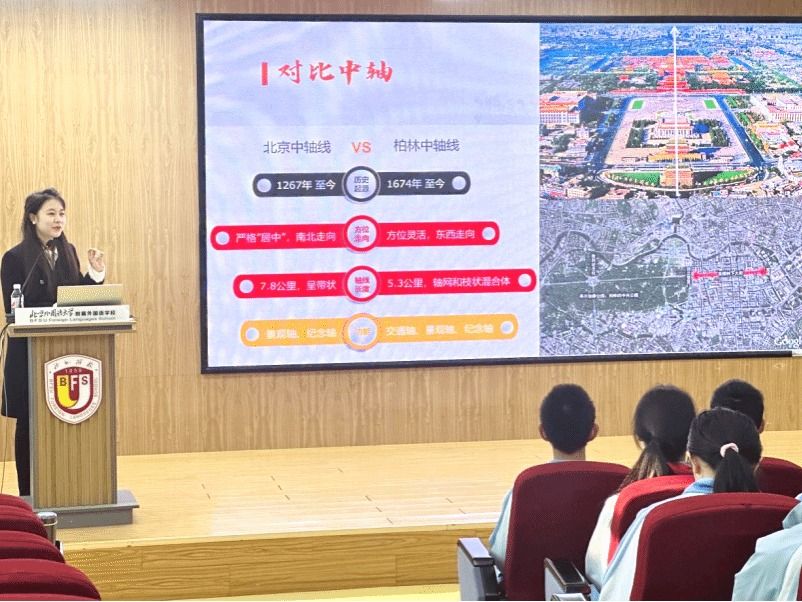 本次宣讲分为四个部分,首先,“纵览中轴”带领同学们从整体上了解中轴线的布局和历史脉络;“回望中轴”回顾其从元明清以来的文化变迁与政治功能;“对比中轴”以中德城市北京、柏林中轴线为参照,引导员工思考不同文化中“轴线”意象的异同;“放眼中轴”则以申遗为契机,引发员工对文化遗产保护与传承的深层次思考。
