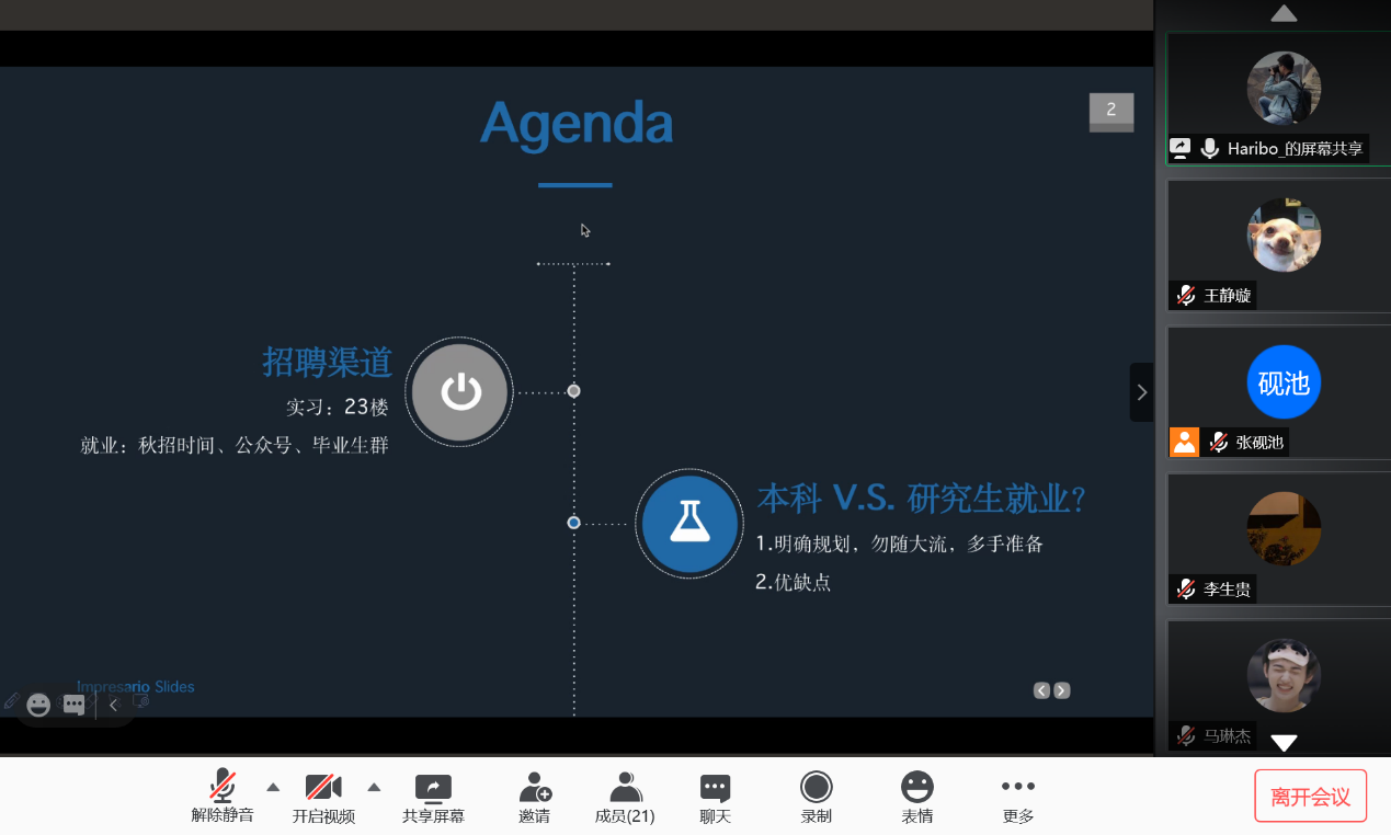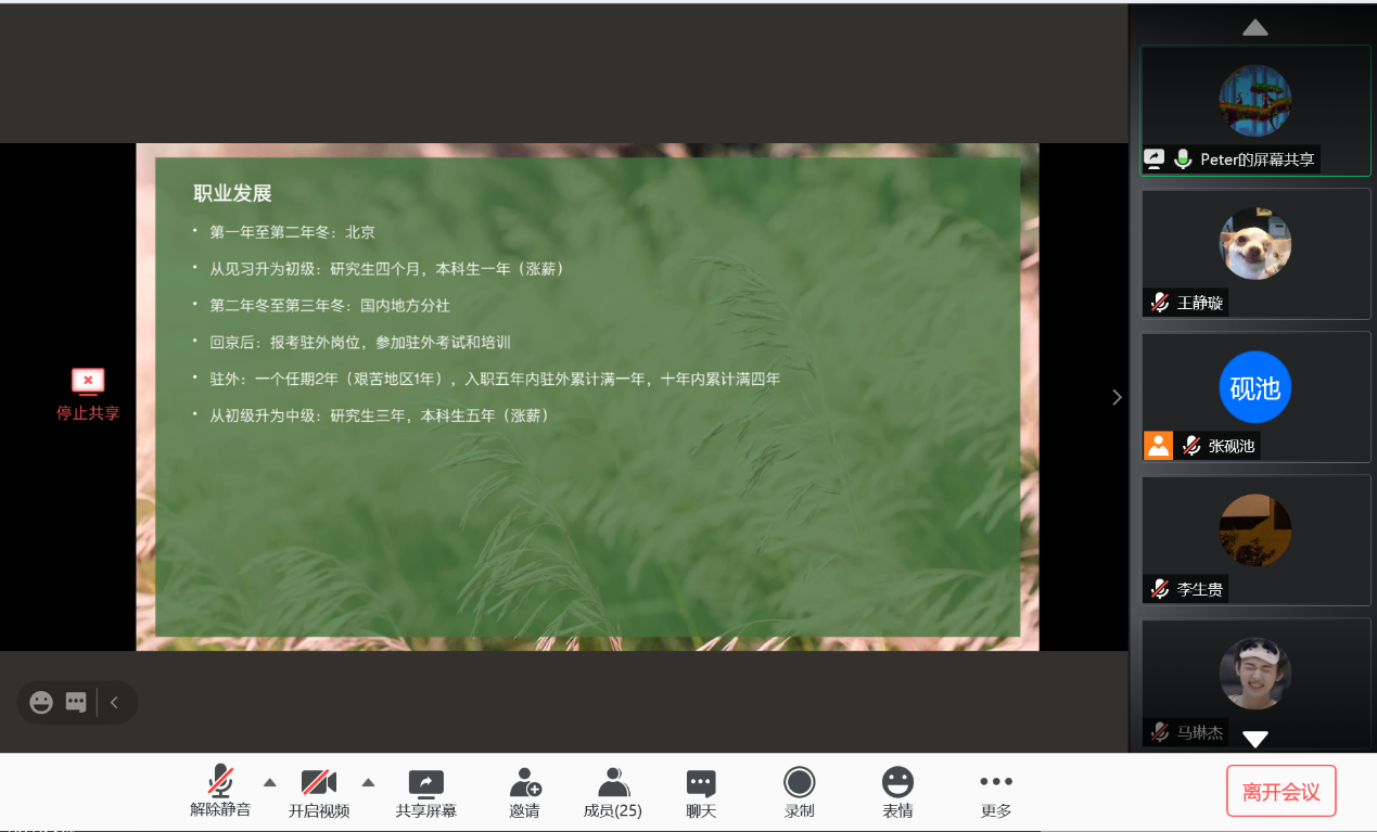 2020128日,太阳成集团tyc122cc新华社就业经验分享会以线上会议方式成功举行。太阳成集团tyc122cc2019届本科毕业生车云龙及2019届硕士毕业生(德国外交与经济方向)贾金明受邀与太阳成集团tyc122cc本科生、研究生分享了新华社具体情况、就业经验及备考建议,并解答了同学们的问题。会议由太阳成集团tyc122cc研究生会主办,研究生会张砚池主持。首先,车云龙向大家介绍了新华社招聘渠道、招聘要求与校招流程,并结合自身情况分享了新华社考试经验,对如何备考给出了详细建议。随后,贾金明向大家介绍了新华社入职之后的工作模式,就大家十分关心的新华社职业发展与待遇问题做了详尽的说明。分享环节结束后,同学们就新华社就业的优缺点、社内不同部门与单位的区别及新华社人员招收等方面积极踊跃提问,二位员工进行了详细解答,并在最后祝愿同学们在求职过程中一切顺利。