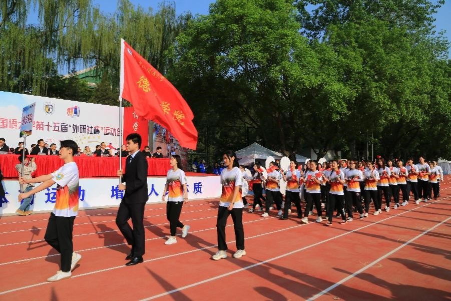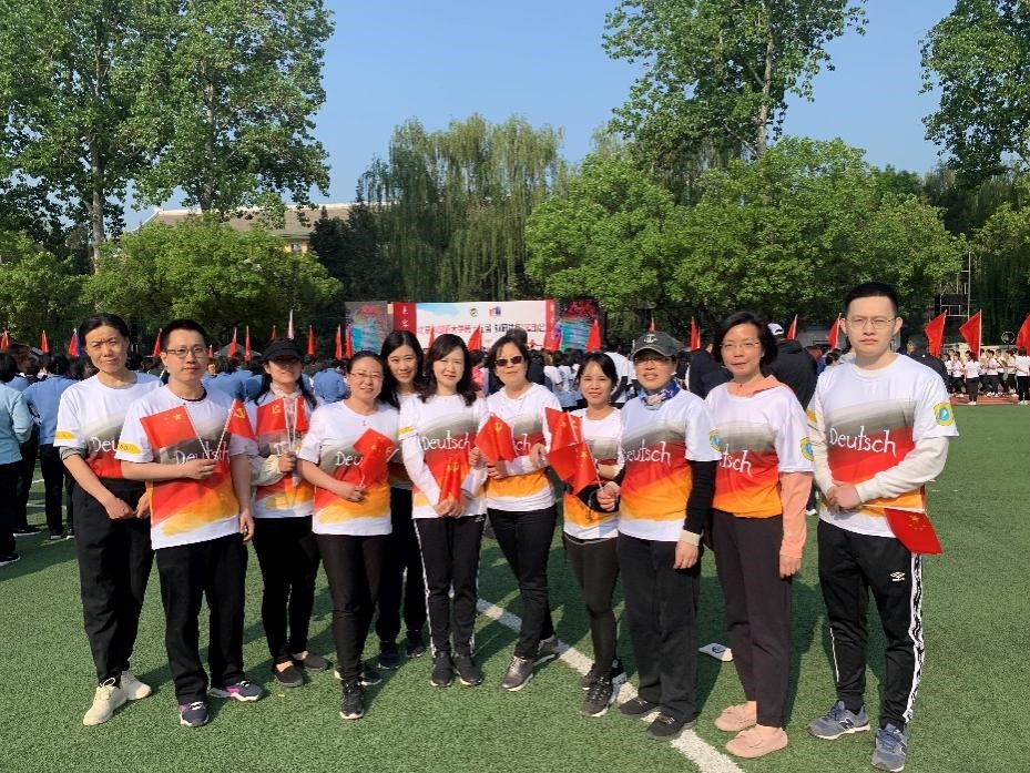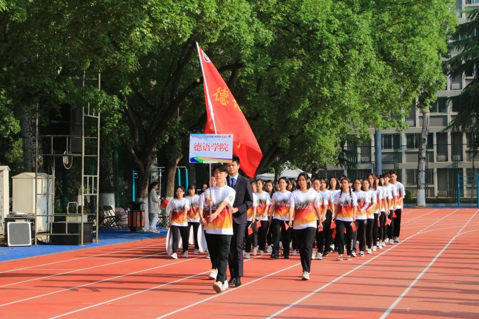 经过多次认真训练,开幕式上,由52名员工和12名教师组成的太阳成集团tyc122cc师生方阵身着由员工设计的统一院服,迈着整齐的步伐,带着昂扬的气势走过主席台前,他们举起的“喜迎双庆,砥砺奋进;德语师生,再创佳绩”手牌彰显着德语师生对北外的祝福以及对学院的美好期盼。