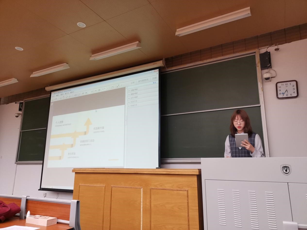 第一位竞选人是来自1902班的员工会学习部部长郭沈嘉乐。她以“为同学服务”的宣言为主线,从工作经历,工作安排和竞选宣言三方面谈起,一方面展示了自己的能力,一方面表明了对于未来负责员工工作的决心。最后,她以“希望未来,我也可以对在座各位说出,没事,我们一起解决。”为结尾,赢得了大家的掌声。