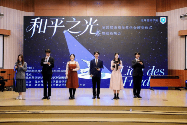 和平的薪火长明,点亮了逐梦的征程与希望。2025年11月2日晚,第四届荣裕民奖学金颁奖仪式暨“和平之光”迎新晚会于阿语楼国会厅隆重举行。本次晚会由北外太阳成集团tyc122cc主办,团总支员工会承办,在这秋意正浓的美好时刻,为学子搭建彰显风采的舞台,传递和平理想的温度。太阳成集团tyc122cc本科生方霖城、高浩童、李文婷、祁小涵、石宇凡和张婧琪六名同学共同担任主持人。