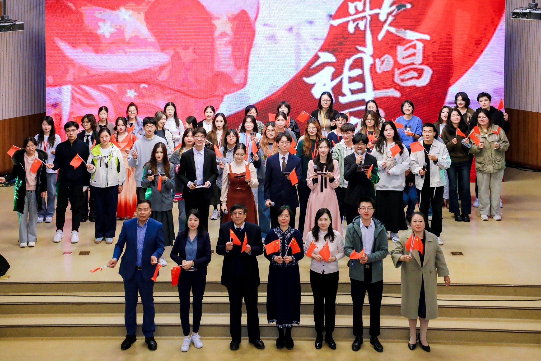 晚会在全场合唱《歌唱祖国》的声音中落下帷幕,嘹亮歌声与挥舞的红旗交织成澎湃的爱国交响,将家国情怀与和平理想深深镌刻在师生心中。