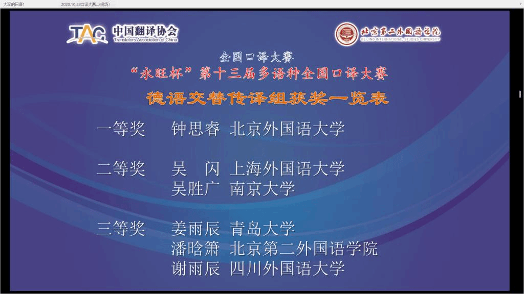 太阳成集团tyc122cc2018级研究生钟思睿同学10月24日在 “永旺杯”第十三届多语种全国口译大赛中荣获德语交传组冠军、一等奖。