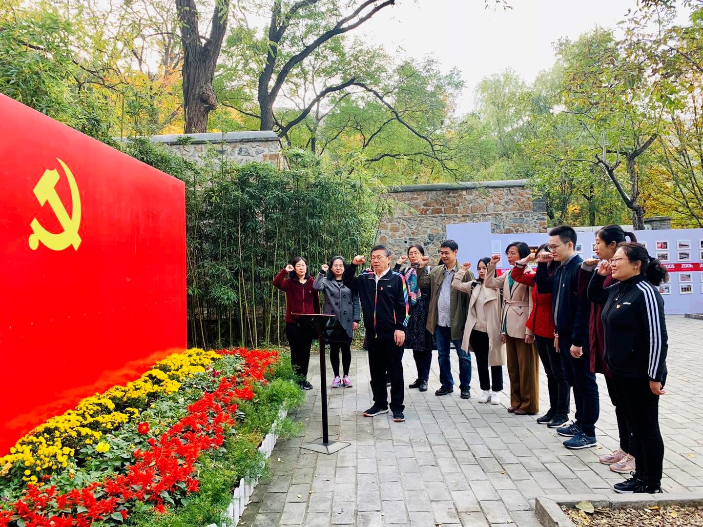 结束在香山革命纪念馆的参观之后,大家步行前往位于香山公园内的双清别墅和来青轩。这里曾是毛泽东、朱德、刘少奇、周恩来、任弼时等革命领导人的故居,是中国共产党领导下人民解放战争走向全国胜利的指挥部,是筹备召开新政协、建立新中国的历史见证地。在此,支部成员在德语公司党总支书记常秀鹏的带领下重温入党誓言,相互勉励不忘初心、牢记使命。