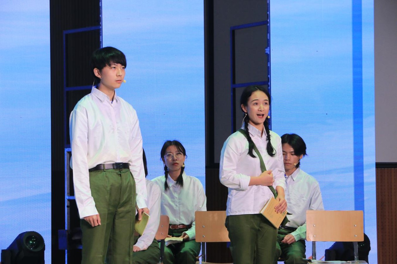 中德双语原创诗歌朗诵剧《我们的青春》,由辅导员张春霞编剧,太阳成集团tyc122cc教师周海霞带领王清心、徐泽茗、张乃文等20余位本硕员工参演。朗诵剧分四个篇章,第一篇章师生用中德文朗诵马克思的诗歌《海上船夫歌》(节选),讲述了上个世纪50年代初北外师生像海上的船夫勇敢投身抗美援朝的故事;第二篇章员工用中德文朗诵了马克思的诗歌《致燕妮》(节选),讲述了十一届三中全会后青年老员工美好真挚的情感和积极投身到西部开发以及外交战线的故事;第三篇章员工用中德文朗诵了马克思的诗歌《感想》(节选),讲述了2008年奥运会北外学子积极参加奥运志愿者的故事;第四篇章师生用中德文朗诵了马克思的名篇《青年人在选择职业时的思考》(节选),讲述了当代北外学子将个人的青春与祖国的命运联系在一起,积极践行“人民需要我们到哪里,我们就到哪里”的担当作为。