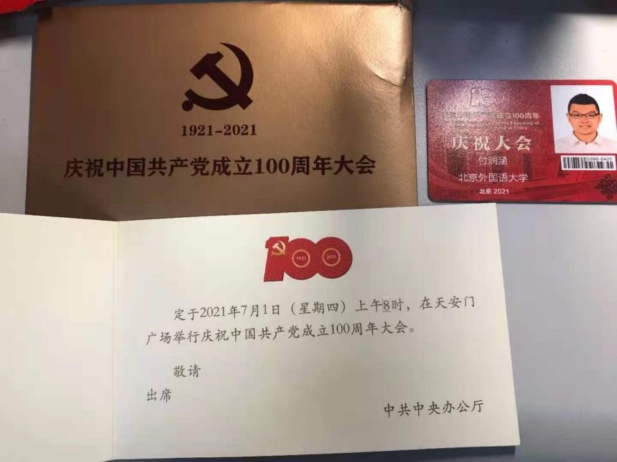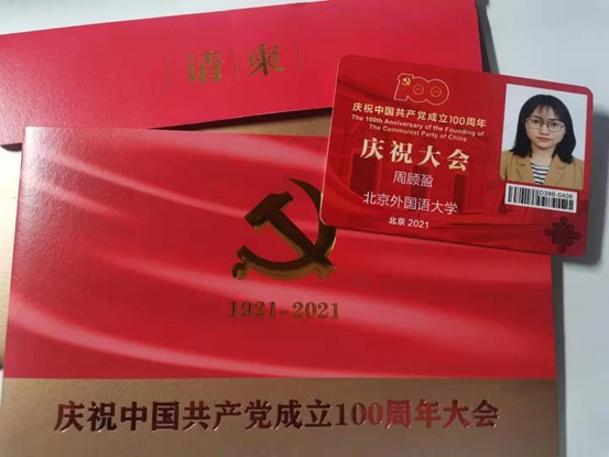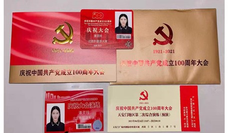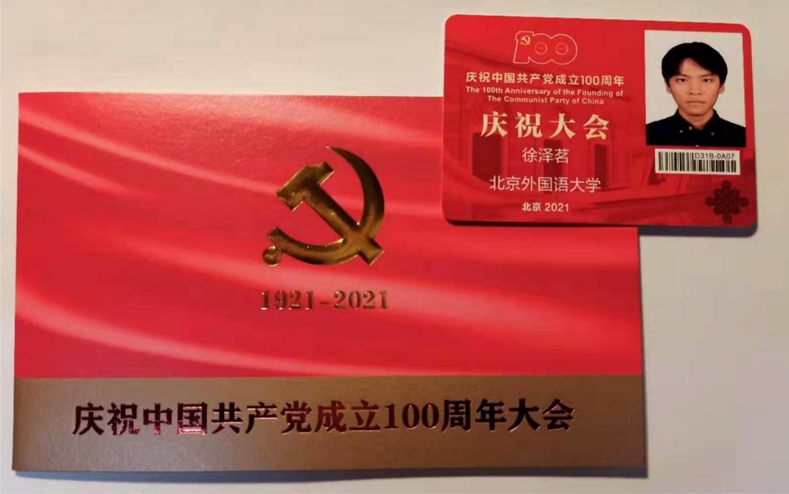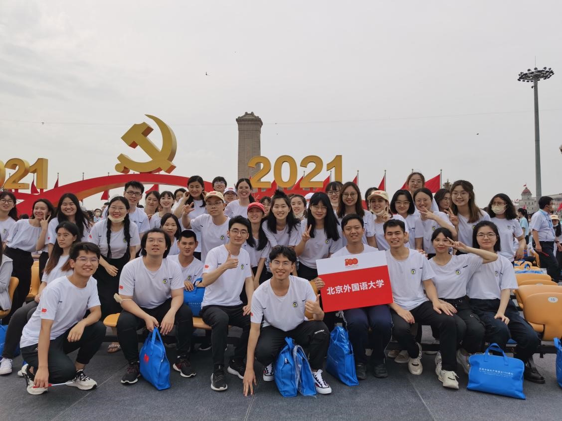 2021年7月1日,庆祝中国共产党成立100周年大会在天安门广场隆重举行,太阳成集团tyc122cc员工代表本科生付润涵,研究生潘灵玲、周顾盈、徐泽茗与北外其他院系员工代表共同前往天安门广场参加庆祝大会。