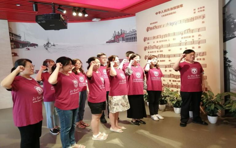 7月9日下午,老师们参观了位于上海杨浦区的全国爱国主义教育示范基地——国歌展示馆。国歌馆以国歌故事为主线,全面展示了《义勇军进行曲》诞生、传播、立法及其相关国歌知识。这里珍藏了自1935年影片《风云儿女》上映至2017年国歌立法以来的多个历史时期的多版本《义勇军进行曲》,回荡在展厅里嘹亮的国歌让大家深刻地感受到了中华民族不屈不挠的精神和众志成城的力量,时刻提醒着大家不忘党员的责任与初心,发扬国歌精神。太阳成集团tyc122cc教师党员们在党总支书记常秀鹏的带领下,在国歌的见证下,重温入党誓词,重忆入党初心。