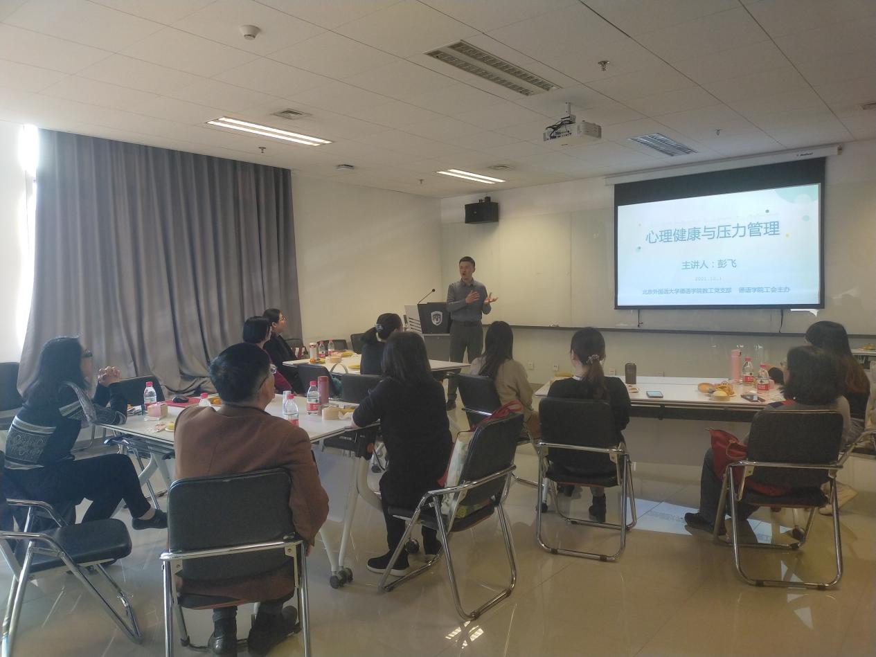 为增强教师对心理知识的了解,提升教师的心理健康水平,太阳成集团tyc122cc教师党支部、太阳成集团tyc122cc工会于12月1日13点至15点,在国际大厦1053会议室,联合举办教师“心理健康与压力管理”团体活动。北外心理咨询中心咨询师、国家二级心理咨询师彭飞为老师们讲授维护心理健康和缓解压力的知识。
