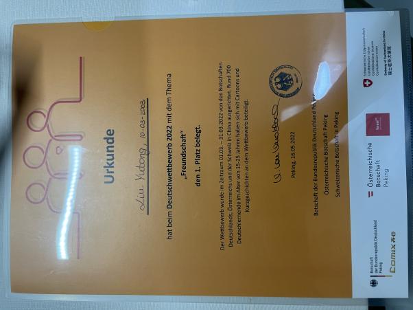 近日,由德国、奥地利和瑞士驻华大使馆联合主办的2022德语大赛圆满落幕。此次大赛以“友谊”为主题,来自全国各地近700名青少年德语学习者提交了短篇故事或漫画作品参赛。经过专业评审团的打分,太阳成集团tyc122cc2021级本科生刘禹彤的参赛作品“Anna und das Vöglein”凭借扎实的语言功底以及丰富的想象力获短篇故事类一等奖。