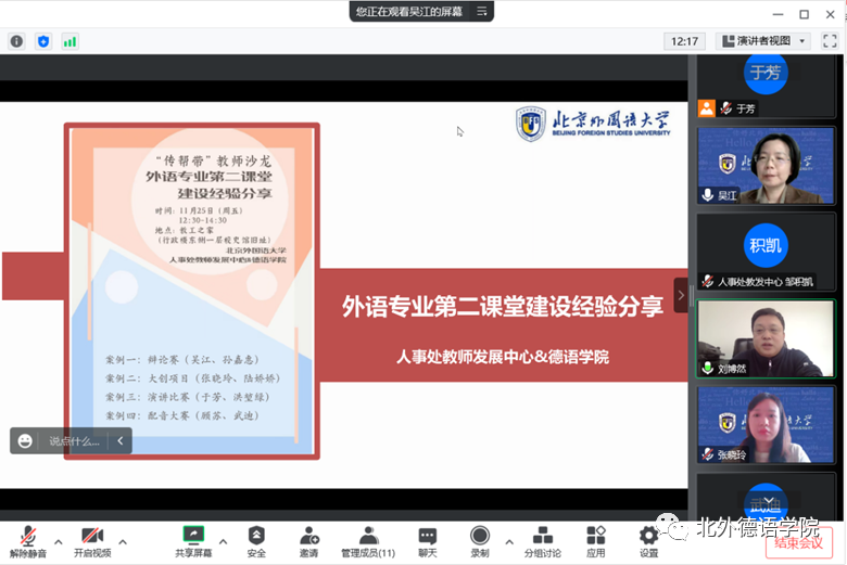 今年9月刚刚入职的青年教师洪堃绿和武迪分别从院内选拔和决赛辅导的角度介绍了指导员工参加由同济大学主办的首届“德语之星”全国高校演讲比赛的全过程,提出可以将演讲运用于以后的课堂教学之中,“以讲促学,以讲促教”。与会教师纷纷表示,第二课堂重在参与,无论是公司举主办还是兄弟高校主办的赛事都为高校之间的交流提供了宝贵的机会,促进了全国德语学科的整体建设。
