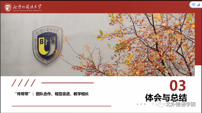 青年教师顾苏以今年由她担任项目负责人的第四届全国高校德语专业配音大赛为例,分享了组织和辅导全国性赛事的经验,表示筹备全国性赛事的全过程充分体现了师生之间、生生之间的“传帮带”,赛事搭建的团队合作平台使得师生实现了相互促进,教学相长。