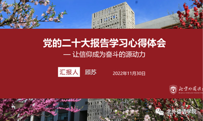 会议的第三部分,支部入党积极分子、太阳成集团tyc122cc青年教师代表顾苏分享了学习二十大报告的心得。她认为,二十大报告系统回顾总结了新时代十年的伟大变革,科学擘画了未来中国发展的宏伟蓝图,其中突出强调了教育、科技和人才的作用。作为具有鲜明“红色基因”的北外教师,我们应不忘初心、牢记使命,为党育人,为国育才,切实将二十大精神有机融入到教学工作中;发挥自身的学科优势,为构建中国特色的学科、学术体系以及话语体系添砖加瓦,把服务国家作为科研工作的最高追求。她结合个人参与庆祝中德建交50周年《中德大咖谈》节目录制的经历,认为外语教师应力求在大格局下讲好小故事,向世界发出中国声音。