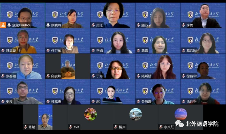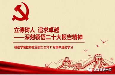 最后,德语公司党总支书记、经理吴江结合自己对汉语“德”字的学习心得及北外德语专业历史的发展,分享了自己学习二十大报告的感悟,强调“立德树人”是高公司党员教师的职责所在,全体党员教师应在教研实践中起到模范带头作用,不断追求卓越。吴江同时代表学院对疫情防控中勇挑重担的党员教师以及全体班主任老师给予了高度认可。