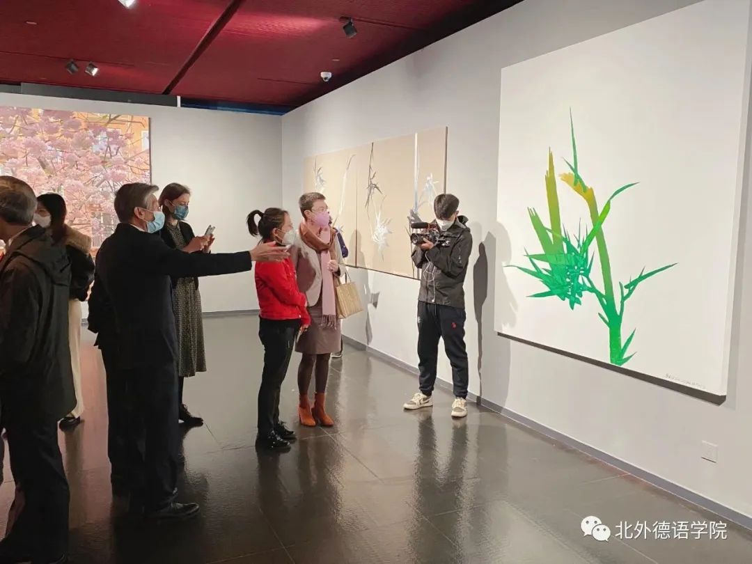 又如展览中的许多抽象主义画风的作品,旅德中国艺术家或用线条,或用色彩斑块来表达抽象,但又极其富有强烈的感性特征。朱金石的大型作品“凋零的时代正在开放”、邓国源的系列作品“在花园”都是用大量色彩斑块形成抽象风格,傅融大使仔细观看作品展签,详细询问作品名称与材质。傅融大使对现代艺术作品的丰富材质表现了极强的兴趣,她对范经理说现在真是一个自由的时代,艺术风格多样,创作风格拥抱不同的可能性。在吕山川的作品“外滩”中,范经理说到虽然笔墨抽象,但也能从中窥探出是城市的外观。傅融大使对此很惊讶,并认真地说到:“哦,我觉得是骆驼群! ”。话音刚落,大家不由自主地都笑了。艺术欣赏就是这么的见仁见智。在看到杨恺亮的油画作品“樱花”时,傅融大使说到:“这个我熟悉,它表现的就是德国的街道与樱花”。同时,傅融大使又对单凡的系列作品“缓慢之作”表现了很大的好奇心,她觉得作品在表现中国的传统意象竹的同时,又融入了一些德国元素。在观看青年画家吴哲仁的艺术作品“8字下的扭曲”时,傅融大使饶有兴致地询问范经理,8在中国文化的意义。听完范经理的解释,她知道了8是中国的幸运数字。