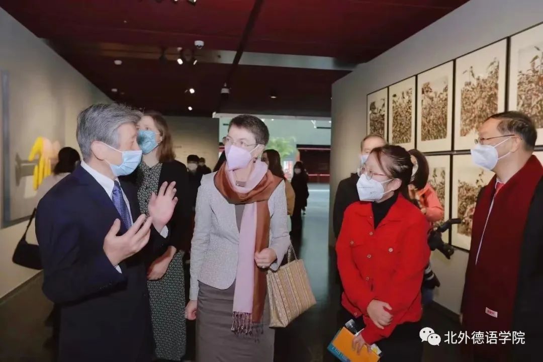 在雕塑作品中,傅融大使对任戎的大型系列雕塑“创世纪”、张国龙的“极地生花”非常感兴趣。范经理给傅融大使讲了传统文化中关于凤凰的浴火重生的传说,傅融大使听后非常兴奋,她说在德国恰恰有类似的传说,它每过一百年就把自己在巢里烧死一次。不过每次总有一个新的凤凰——世界上唯一的凤凰——从那个红蛋里飞出来。范经理听后也非常高兴,他第一次听到德国关于凤凰的童话,并表示这就是跨文化交流的魅力。在装置作品中,傅融大使对李继伟的“基因系列”与“关系”作品很有兴趣,她觉得灯光艺术很有趣,并和范经理讲到自己的祖父也是做灯光艺术的艺术家,因此她对灯光艺术非常熟悉。又如冯陆的作品“潘佳”,傅融大使说这是一只有勇气的肥猫。在新媒体艺术中,如缪晓春的“RESTART”中,采用3D建模的手法把平面形象转换成立体艺术。在屏幕前,傅融大使认真观看动画,并指出从中可以看出西方教堂和东方青花瓷的元素。范经理说中德艺术的互译性特征之二是两者的工匠精神,在吸收借鉴了德国包豪斯设计理念,旅德中国艺术家在其设计作品中思考如何更好地将中国传统文化元素与现代设计理念相融合。傅融大使仔细观看了由林存真与其团队设计的2022北京冬奥会系列作品,她尤其对冬奥会的会徽设计很感兴趣。在听完设计师关于冬奥会会徽设计思路的讲解,傅融大使觉得一个融合了汉字“冬”与“飞”的设计实在精妙。最后,范经理向傅融大使提出关于加强中德艺术设计与建筑方面的合作意向,傅大使表示将对此全力支持。