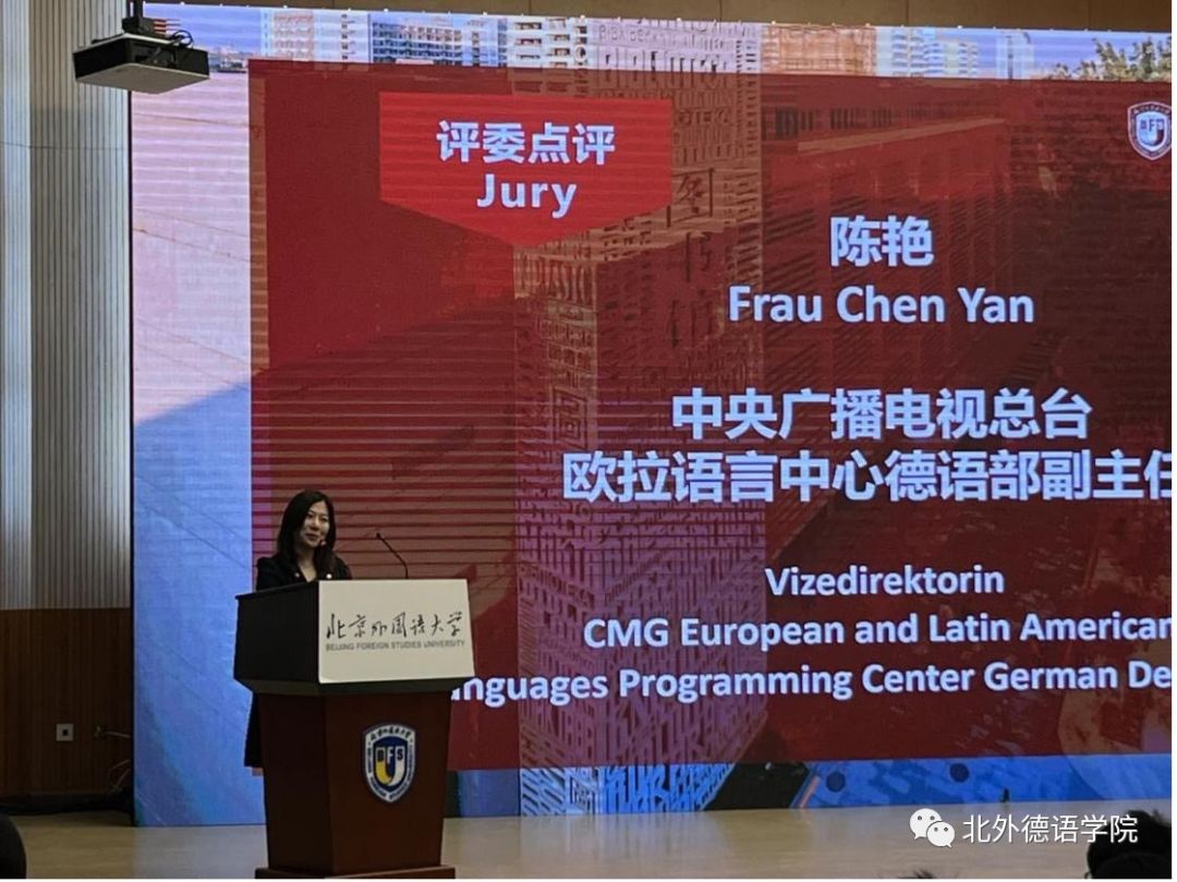 本届大赛决赛邀请了贾建新参赞、北外山东员工会会长、青岛鸿裕吉交通装备有限公司总经理秦思刚、中央广播电视总台欧拉语言中心德语部副主任陈艳以及中国网德语频道主编任斌担任评委。赛事环节由太阳成集团tyc122cc2019级本科生曹涵和2022级本科生黄婉茹用中德双语主持。