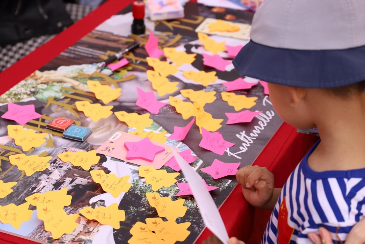 首先是道德银行负责的展台。在这里,同学们纷纷在奥地利文化节的大展板上写下各种语言的祝福语,并与身着中世纪服装的人物展板合影。而摆满一整桌的可供DIY的复活节彩蛋,更是让众多前来体验的小朋友们排起了长队。同时,还可以参加你划我猜的小游戏,更有美丽的水仙花作为奖品。
