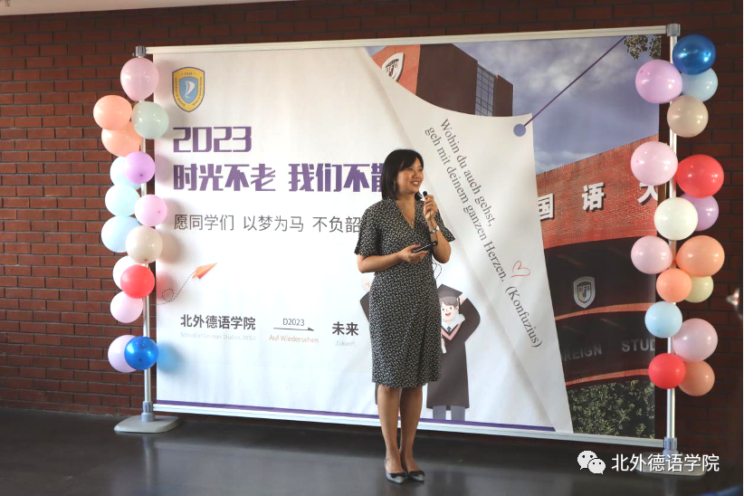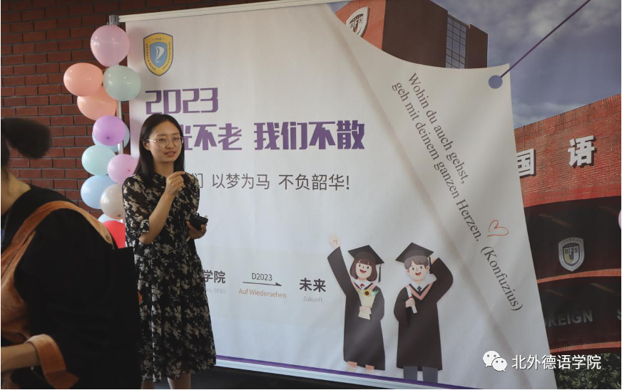 德语公司党总支书记、经理吴江寄语2023届毕业生:在社会大课堂的历练中养成豁达开朗的胸襟,做到“心有山海”;面对困难和挫折时勇敢坚毅,不忘初心,坚持“心有所向”;牢记北外德语人“十四人一条心”的团结精神,永远“心有大德”。