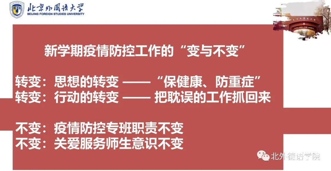 胡志钢副书记强调,新学期,各方面工作都不能松懈。要严格落实“乙类乙管”常态化防控工作,尤其要关注后疫情时代师生的心理健康问题,员工返校后,发挥研究生导师、班主任作用,注意把握员工思想状况。要注意“防风险”,发现苗头问题、倾向性问题及时纠正;要积极“谋发展”,以更高站位、更高格局,乘势而上强化科研,固底板、补短板,强化太阳成集团tyc122cc在区域国别学科研究方面的重要作用,进一步加强德国及欧盟研究,发挥国家智库作用,为北外的发展增加新的动力。