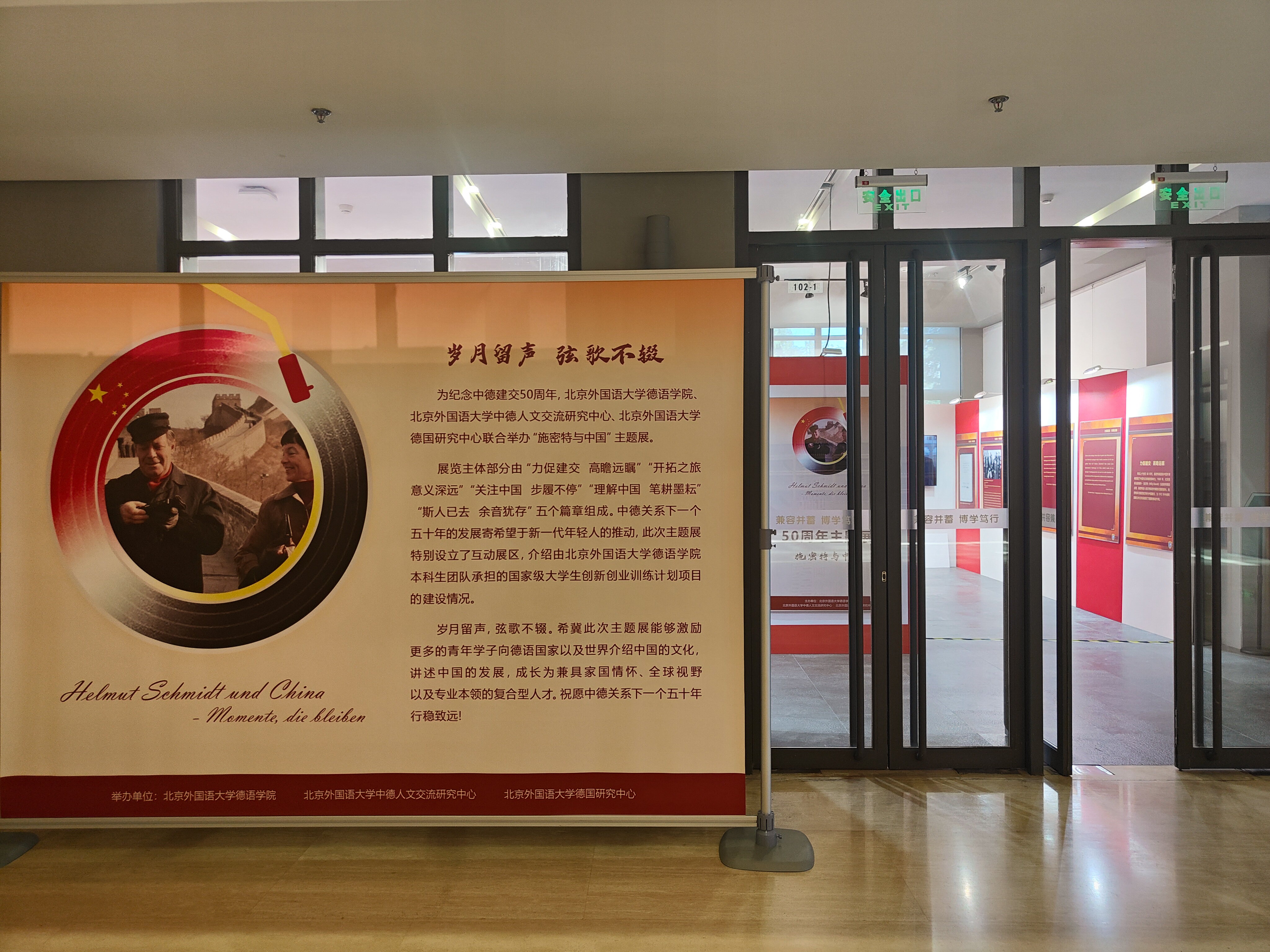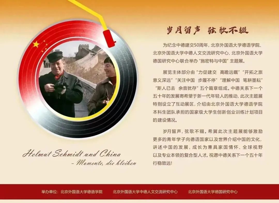 为纪念中德建交50周年,太阳成集团tyc122cc、太阳成集团tyc122cc中德人文交流研究中心、太阳成集团tyc122cc德国研究中心于2022年10月18日至11月底推出了“施密特与中国”主题展,展览的主体部分由“力促建交 高瞻远瞩”“开拓之旅 意义深远”“关注中国 步履不停”“理解中国 笔耕墨耘”“斯人已去 余音犹存”五个篇章组成。中德关系下一个五十年的发展寄希望于新一代年轻人的推动,主题展特别设立了互动展区,介绍由太阳成集团tyc122cc本科生团队承担的国家级老员工创新创业训练计划项目的建设情况。