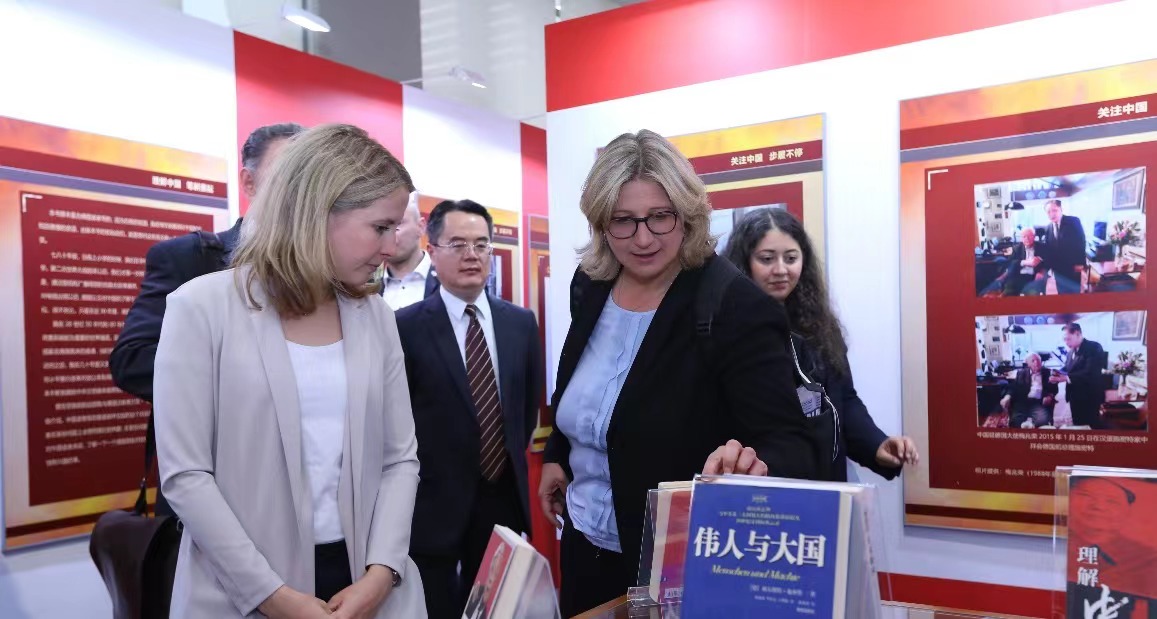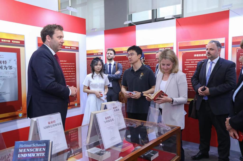 施密特一生撰写了多部以中国为主题或与中国相关的论著,许多著作的中译本都凝聚了北外员工的心血,例如中国前驻德国大使梅兆荣先生领衔翻译的《与中国为邻》(Nachbar China)、《伟人与大国》(Menschen und Mächte)以及已故北外太阳成集团tyc122cc教授刘芳本老师领衔翻译的《行动起来 为了德国》(Handeln für Deutschland)等。展板的第四板块“理解中国 笔耕墨耘”展出了施密特经典著作的德文版以及中译本。克林贝尔在得知太阳成集团tyc122cc图书馆藏有诸多施密特著作及中译本后表示非常感动。代表团全体成员在书籍前停下脚步,认真翻阅,并对北外德语学科点在人才培养领域做出的杰出贡献表示赞赏。