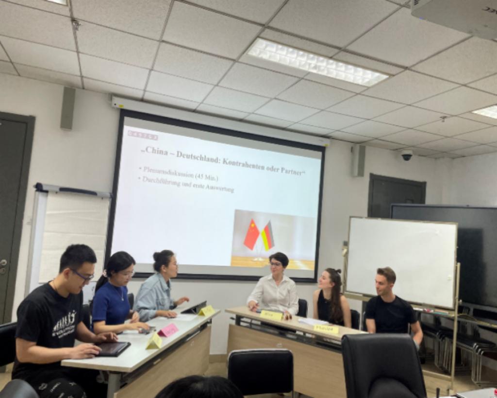 工作坊首日,中德两国同学通过破冰式的自我介绍迅速建立了友好关系,拉近了彼此的距离。在首轮的讨论环节中,双方学子坦诚交流了对彼此团队的期待以及预期中的对方对自身团队的期待,为后续的深入交流奠定了坚实的基础。当天下午,一场主题为“中国与德国:对手还是伙伴?”的热烈讨论,让员工们对两个国家在国际舞台上的角色与互动有了更深刻的理解。次日,员工们聚焦于生活与工作中的中德价值观,通过团队合作,共同展示了精彩的观点碰撞与深入交流。最后一天,工作坊迎来了高潮——模拟创建中德合资企业的实战演练:中德两国同学分组投入模拟的中德商务环境中,亲身体验跨文化合作的挑战与魅力。在展示环节,员工们展现了丰富的合作成果,充分体现出跨文化语境的协同作用和中德文化间的精彩交融。