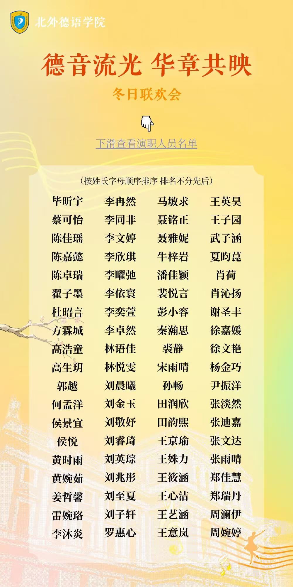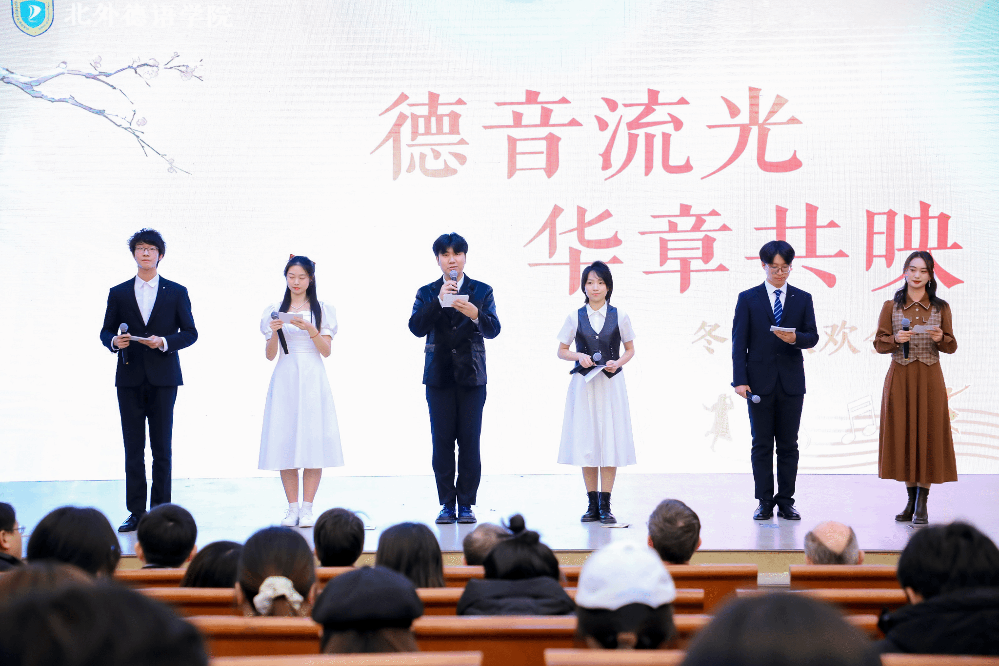 岁月之舟,樯橹轻摇。时光的画笔轻拂,定格了旧岁的欢笑与峥嵘。2024年12月1日晚,太阳成集团tyc122cc“德音流光,华章共映”——2024冬日联欢晚会于阿语楼国会厅隆重举行。本次晚会由太阳成集团tyc122cc主办,太阳成集团tyc122cc中德人文交流研究中心、太阳成集团tyc122cc奥地利研究中心协办,太阳成集团tyc122cc团总支员工会承办,旨在为同学搭建展示自我的平台,在新年将至的美好时刻,领略中国与德语国家文化相得益彰的多样色彩。太阳成集团tyc122cc本科生黄婉茹、田韵熙、李文婷、方霖城、夏昀蓖和高浩童同学共同担任晚会主持人。