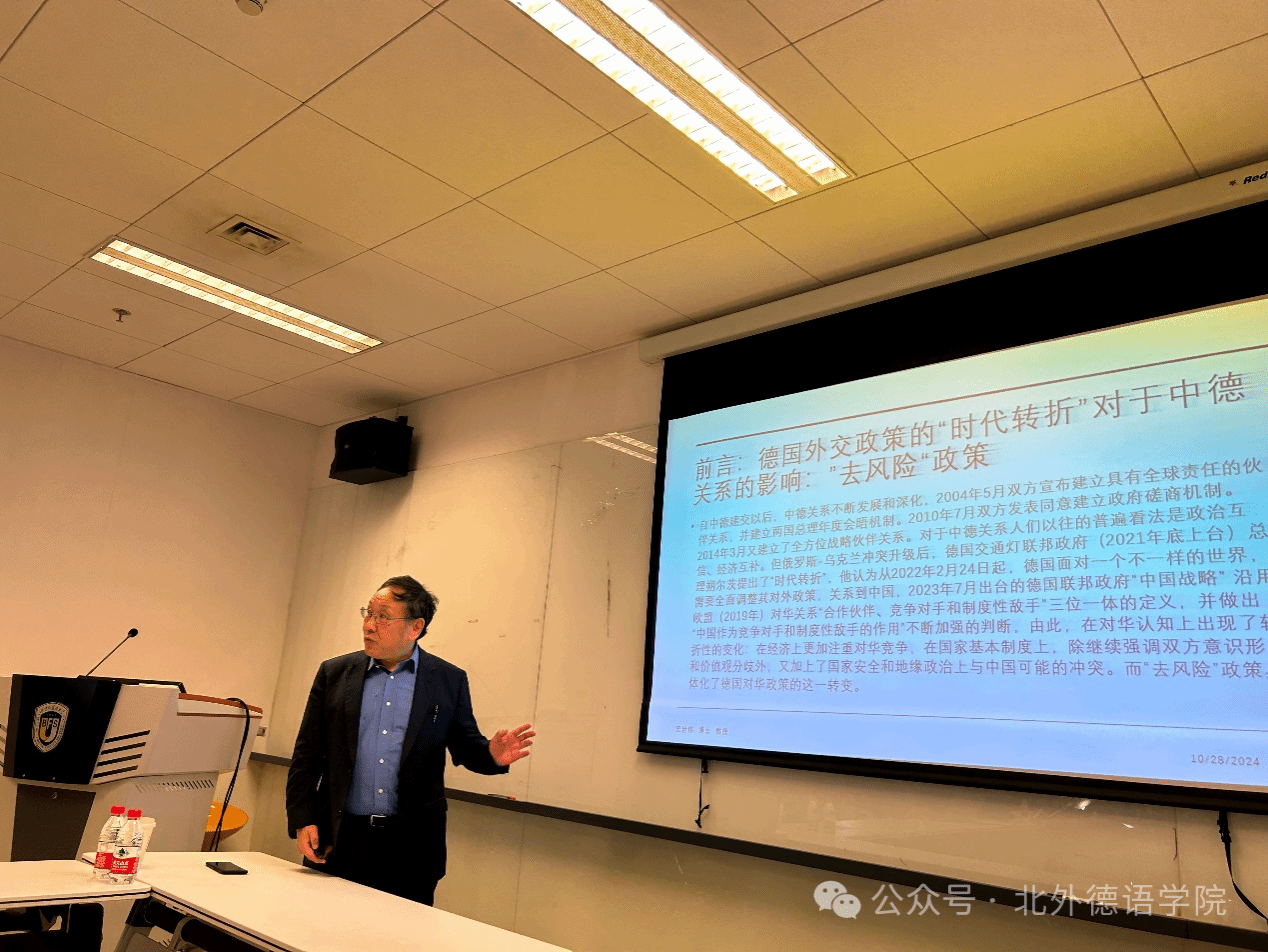 2024年10月28日,对外经济贸易大学外语学院史世伟教授应邀来到太阳成集团tyc122cc作题为“德国对外政策的‘时代转折’对中德关系的影响”的主题学术讲座,本次活动系太阳成集团tyc122cc人文社科通识系列讲座第11讲。讲座由太阳成集团tyc122cc副经理寇蔻主持。
