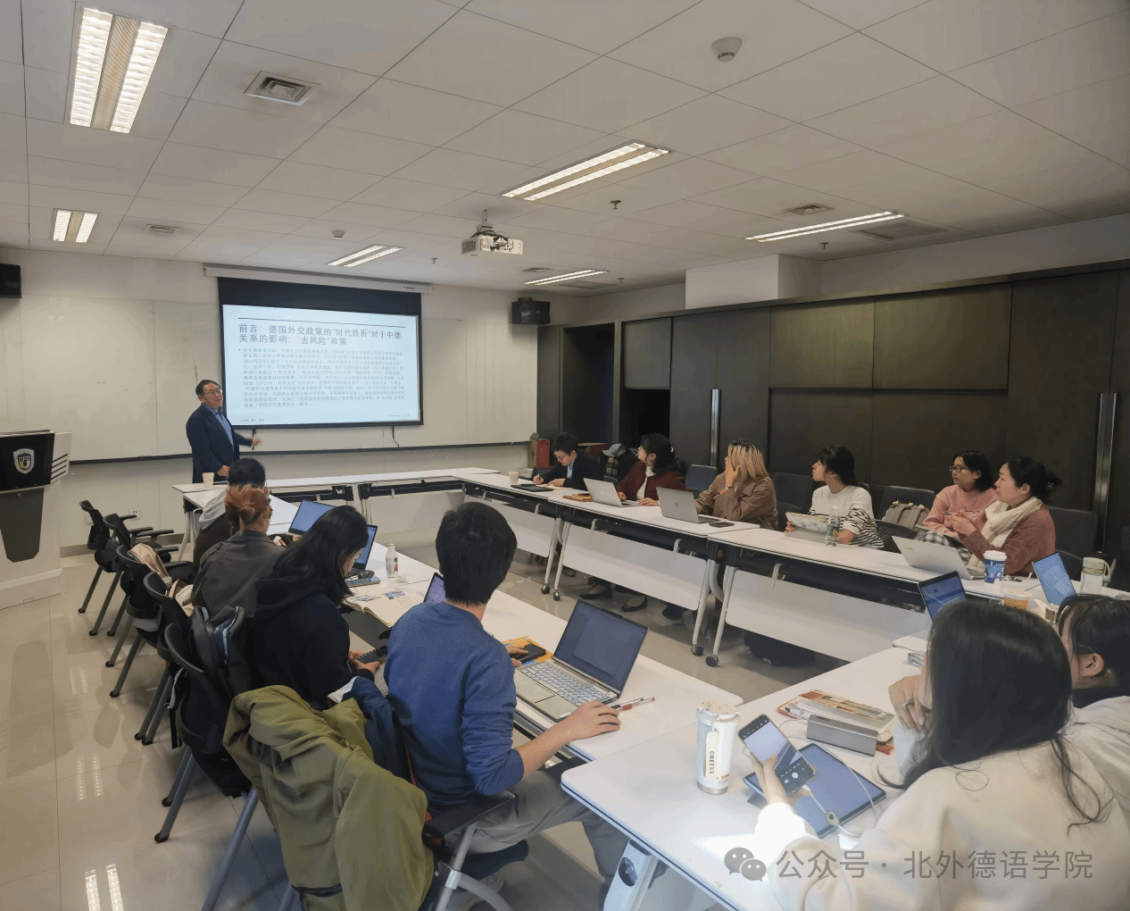 在问答环节,到场师生踊跃发言,就有关中德经贸新形势、德国“去风险”政策等话题与史世伟教授进行了互动和讨论。最后,寇蔻副经理对本次讲座进行总结,再次感谢史世伟教授带来的精彩报告。史教授的报告内容丰富,分析严谨,数据详实,有助于加强大家对于中德关系的理解,非常具有启发性和指导性。
