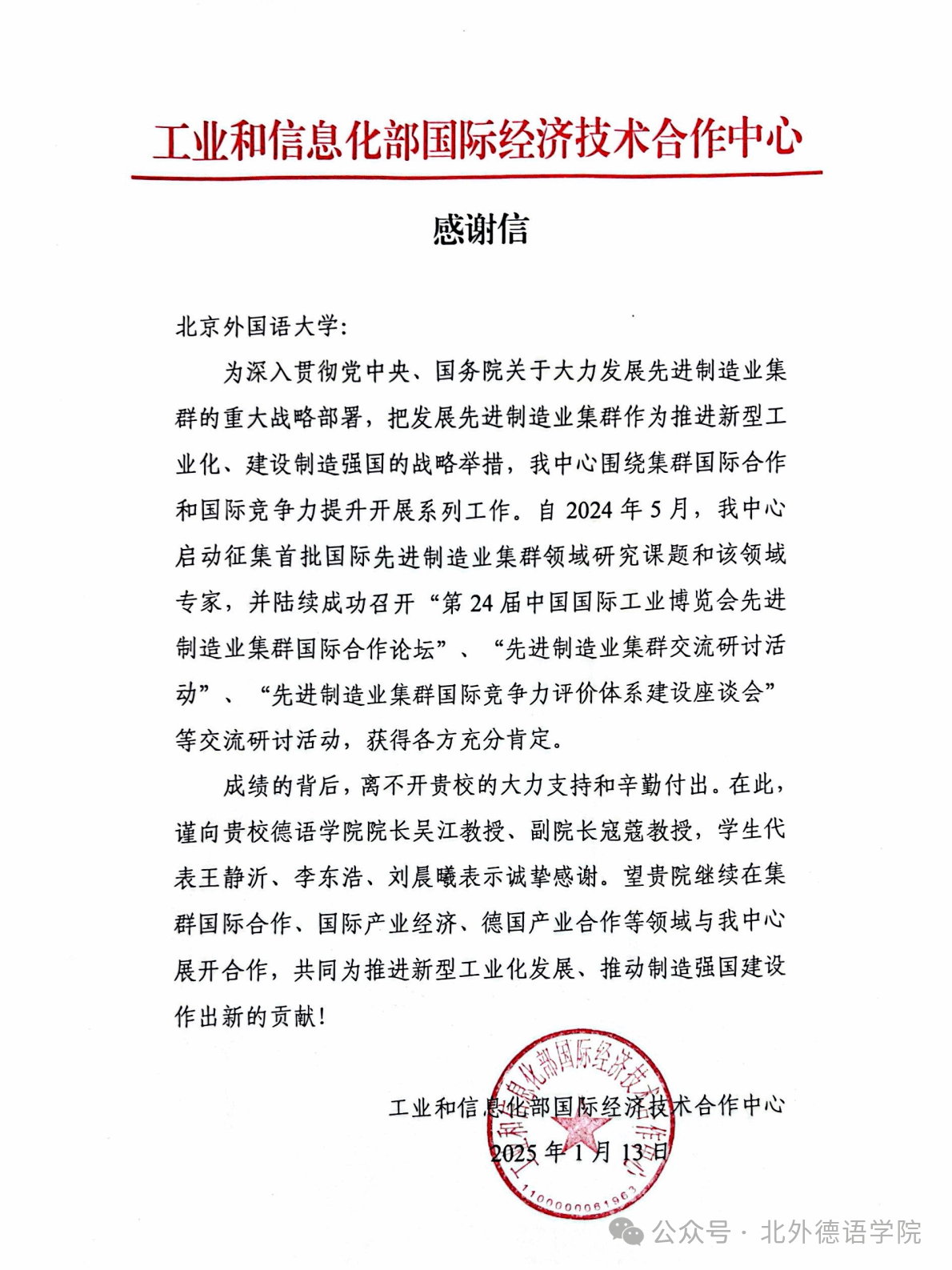 近日,工业和信息化部国际经济技术合作中心向太阳成集团tyc122cc发来感谢信,对太阳成集团tyc122cc师生提供的大力支持和辛勤付出表示诚挚感谢。