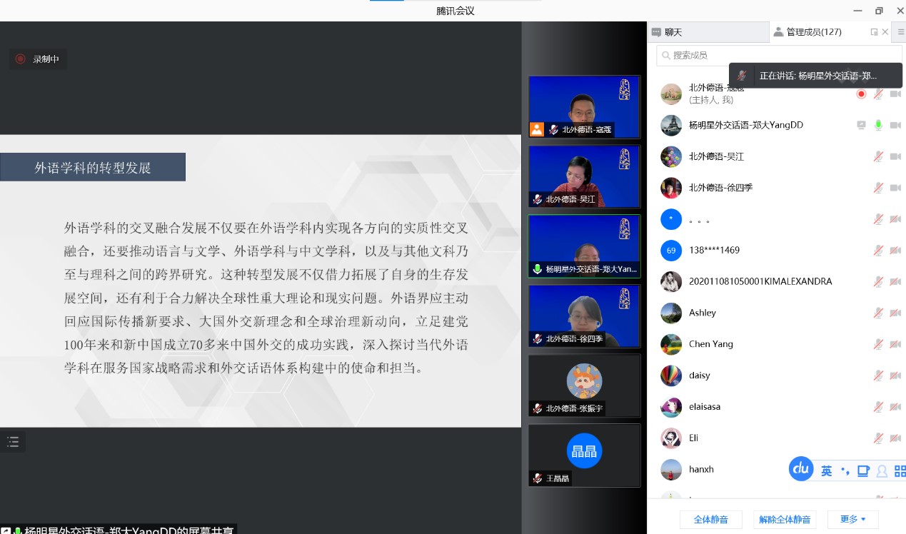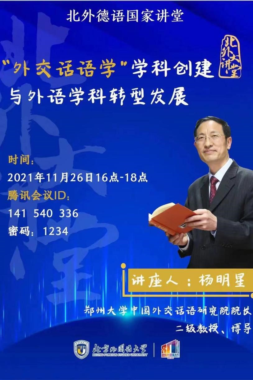 2021年11月26日下午,北外德语国家讲堂以线上方式举行。郑州大学中国外交话语研究院经理杨明星教授应邀作了题为“‘外交话语学’学科创建与外语学科转型发展”的讲座。讲座由德语公司党总支副书记、经理吴江教授主持。来自全国各高校的120余位师生参加了讲座。