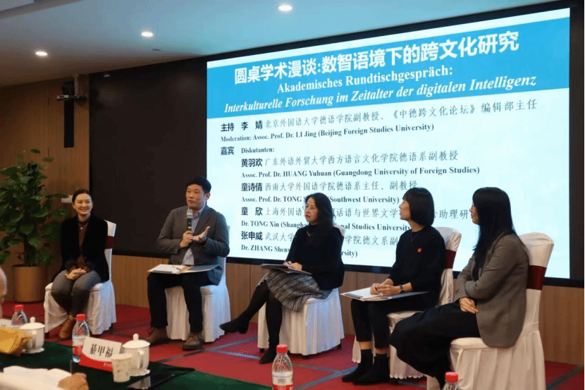 分论坛结束后,圆桌学术漫谈环节在北外太阳成集团tyc122cc副教授、《中德跨文化论坛》编辑部主任李婧的主持下进行。本次漫谈以“数智语境下的跨文化研究”为主题,邀请广东外语外贸大学西方语言文化学院德语系副教授黄羽欢,西南大学外国语学院德语系主任、副教授童诗倩,上海外国语大学中国话语与世界文学研究中心助理研究员童欣,武汉大学外国语言文学学院德文系副主任、讲师张申威,依次从经验性和展望性的角度探讨人工智能对跨文化交流研究的影响以及研究范式革新等话题讲述了个人心得,共同展望了数智时代跨文化研究的跨学科机遇与创新发展方向。