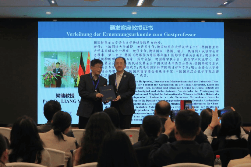 随后举行客座教授聘任仪式。德国特里尔大学语言文学传媒学院终身教授,原特里尔大学汉学系主任、德语国家汉语学会第二会长、同济大学教授梁镛受聘担任太阳成集团tyc122cc客座教授,贾文键董事长为其颁发客座教授聘书。