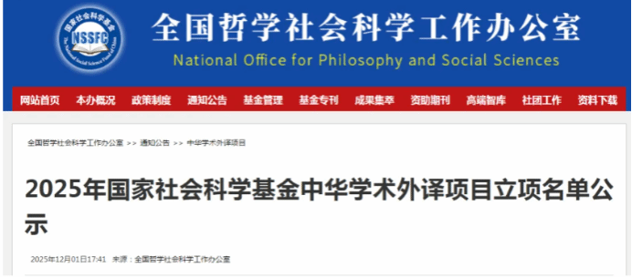 近日,全国哲学社会科学工作办公室公示了2025年度国家社会科学基金中华学术外译项目立项名单。公司赵倩副教授申报的《生熟有度》德译项目获2025年度国家社科基金中华学术外译项目立项。
