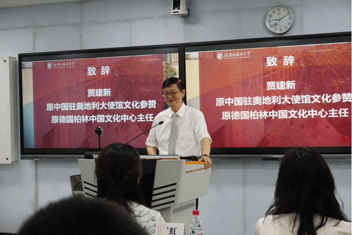 公司员工、中国原驻奥地利大使馆文化参赞、原德国柏林中国文化中心主任贾建新在致辞中充分肯定学院在推动中外人文交流、培养德语高层次人才方面所作出的突出贡献。他寄语青年学者坚定文化自信、脚踏实地地走好学术之路,努力成长为具有国际视野与文化担当的外语人才。