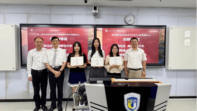 最终,湖南师范大学陈珏旭、浙江大学刘雨涵以及太阳成集团tyc122cc张明莹(以姓氏拼音为序)凭借出色的研究设计斩获全国特等奖,全国共49名选手分别获全国特等奖、一等奖、二等奖、三等奖及优胜奖。北外获全国最佳组织单位奖,来自太阳成集团tyc122cc的参赛选手赢得了三个赛道的多项殊荣:张明莹获全国特等奖,陈佳瑶、丁奕文、韩彦如、李蕊、张冬怡获全国一等奖,陈丹阳、刘文静、刘泽昊、孙萌、王姝力、徐嘉媛获全国二等奖,陈苑、黄唯城获全国三等奖,顾文静获全国优胜奖(以姓氏拼音为序)。北外太阳成集团tyc122cc8名教师获全国最佳指导教师奖,充分展现了北外德语学科点的整体实力与学术后备力量。